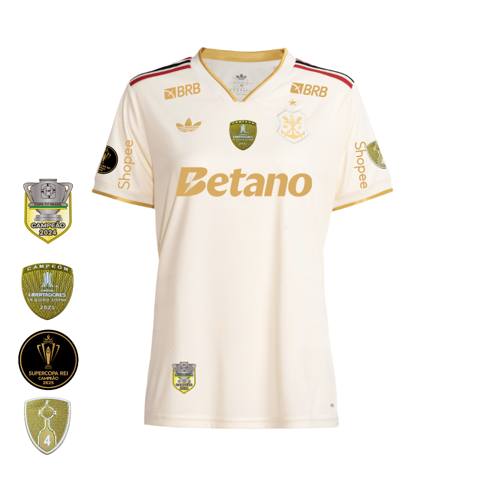 Camisa Flamengo Dourada | Jogo 3 2025 | Todos os Patchs de Campeão Com Patrocínios | Feminina