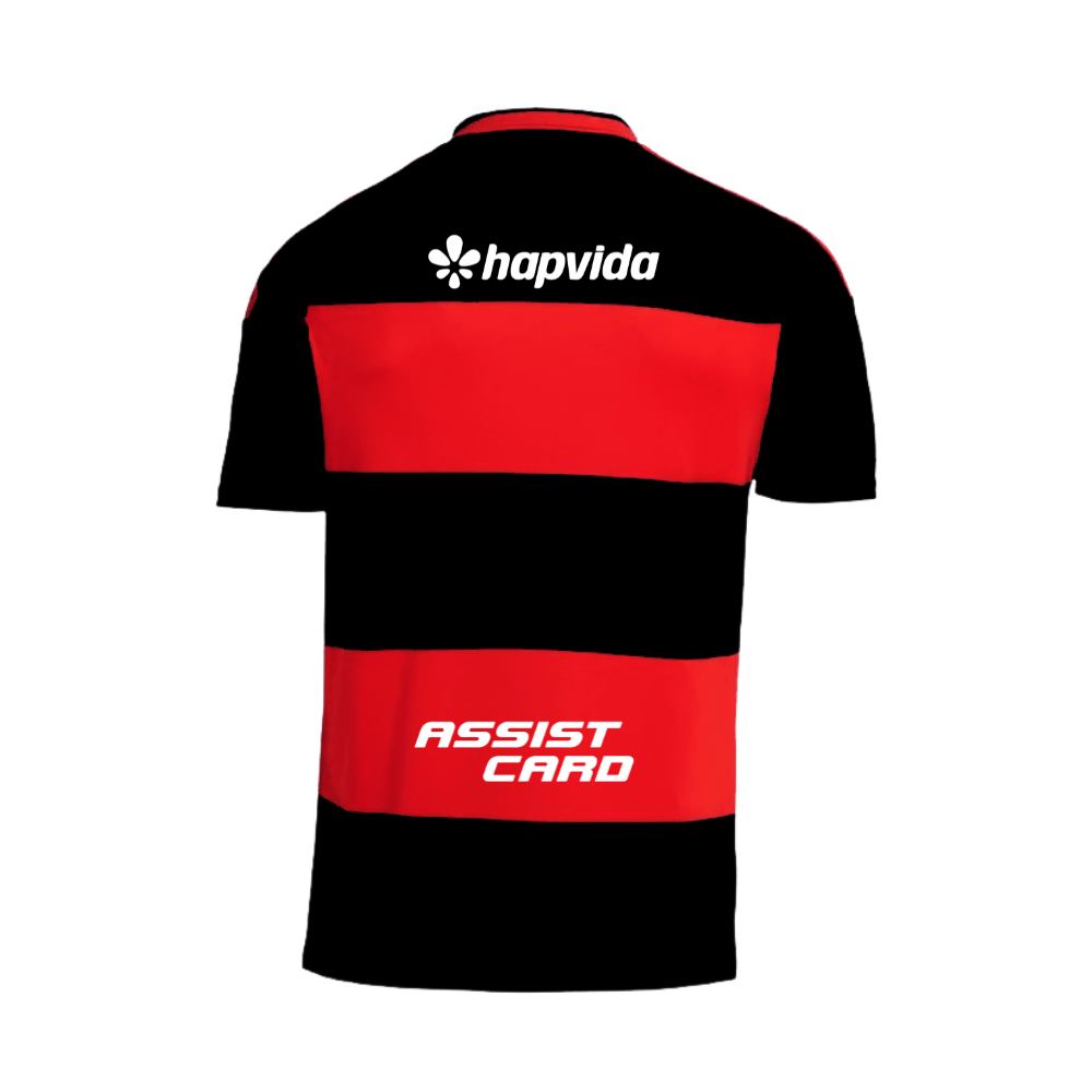 O escudo oficial, bordado com precisão no lado esquerdo do peito, ocupa o lugar de honra — exatamente sobre o coração. Os detalhes em tons que complementam o vermelho e o preto trazem sofisticação sem comprometer a tradição. A gola careca, limpa e moderna, reforça o visual esportivo e versátil da peça.
