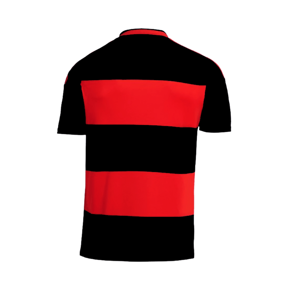 O escudo oficial, bordado com precisão no lado esquerdo do peito, ocupa o lugar de honra — exatamente sobre o coração. Os detalhes em tons que complementam o vermelho e o preto trazem sofisticação sem comprometer a tradição. A gola careca, limpa e moderna, reforça o visual esportivo e versátil da peça.